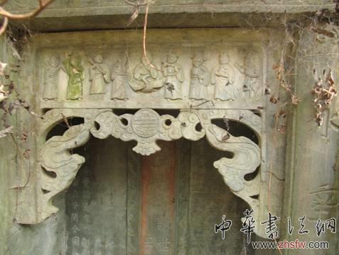 該墓葬座東北朝西南50度,仿木結(jié)構(gòu)石質(zhì)建筑,由青石條磊砌而成,墓冢寬6.4米,高2.3米。墓葬已被泥石掩埋。從墓葬前鏤空小錢狀窗戶可見部分墓室內(nèi)部結(jié)構(gòu)。有兩道石板封門,墓門上陰刻門神、花卉等,石質(zhì)墻壁上陰刻花卉等圖案。東南門正中陰刻“修明山千心秀苦”、“有三個(gè)兒子小為人”、“我只得請石匠圓工封山”,西北側(cè)墓門被耕地掩埋。墓室內(nèi)可見已腐朽槽朽的棺木。由于墓室無法進(jìn)入,結(jié)構(gòu)及長度等信息無法采集。后壁樹有神位。東北側(cè)部分門窗人為損壞,前墓門被泥石掩埋。