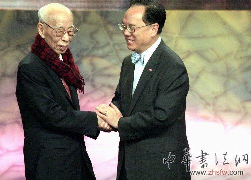 資料圖:四月二十一日,香港特區(qū)行政長官曾蔭權為最高榮譽“終身成就獎”得主國學大師兼漢學家饒宗頤教授頒獎祝賀。中新社/張勤/攝