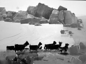 《黑羊逐浪》這是畫家在海灘旁偶然發(fā)現(xiàn)的奇景,山坡上一群黑色的東山羊與明亮的海灘形成強烈的對比。羊群躍動,海波逐浪,構成了和諧的韻律,一幅充滿浪漫和詩意的畫面由此而生。