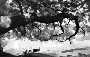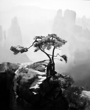 《胡楊》畫家以雷霆萬鈞的筆觸一下子就把生活在新疆戈壁沙漠、飽經風霜而屹立不倒的胡楊雄姿刻畫得淋漓盡致,喻意中國人頑強的生命力和斗志,同時亦表達自己的心跡。