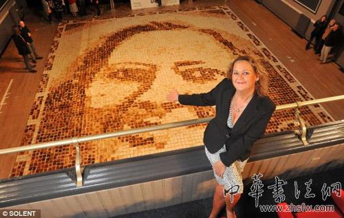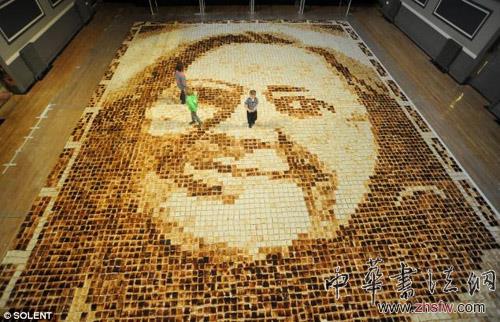 據(jù)英國(guó)《每日郵報(bào)》10月18日消息,今年27歲的珊佳·霍特菲爾德是一名博物館館長(zhǎng),她利用業(yè)余時(shí)間,使用600個(gè)大面包為自己的婆婆制造了這幅尺寸驚人的畫像。在制作過程中,她耗光了9塊面包機(jī)電池的電量,才將這些面包切成她需要的9852片。之后珊佳將其中的一部分烤焦、一部分烤熟,并錯(cuò)落有致地?cái)[放,直至拼出自己想要的圖案——婆婆的畫像來。