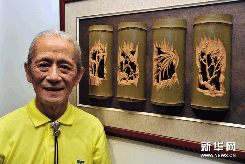 (2)8月24日,陳春明在其創(chuàng)作的竹雕作品《四季花》旁留影?! ?/p>