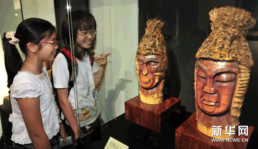 (3)8月24日,小朋友在觀賞陳春明的竹雕作品《齊天大圣》與《唐三藏》。