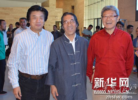 劉曦林(左)與嘉賓在展覽現(xiàn)場