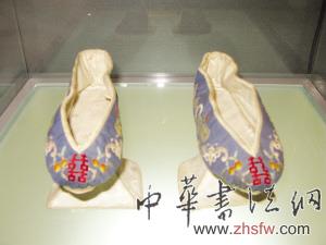 此次還展出了兩雙旗鞋,稱“高底鞋”,由于形似花盆,也有稱為“盆底鞋”,還有的像馬蹄,稱“馬蹄底鞋”。記者發(fā)現(xiàn)“高底鞋”都較大,但木跟高達(dá)10厘米。袁榮解釋說:“滿族婦女不纏足,他們自古有‘削履’的習(xí)俗,冰雪天穿草鞋防滑。其余時(shí)間則穿木底鞋,以便在疏松的土地上活動(dòng)。鞋跟是用白細(xì)布裱蒙,鞋面用刺繡、穿珠制作??赡苁撬麄兇┍缎木壒?,所以穿這么高的鞋也習(xí)慣了。”慈禧太后穿的高底鞋比較特別,把鞋頭做成一個(gè)鳳頭形,嘴銜珠穗,因此稱為“鳳頭鞋”。