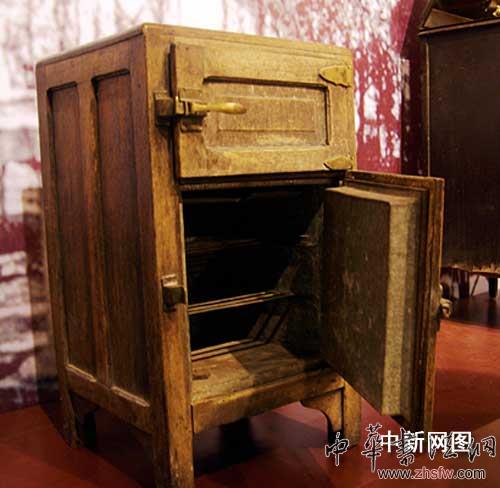 圖為溥儀用過的西式木制冰箱,將冰塊放入冰箱上層,即可為儲存在冰箱下層的食物保鮮。