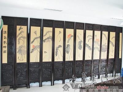 實際上,屏風的種類很多,可以按形制、題材、材質(zhì)和工藝來劃分。按形制劃分,屏風有插屏(亦稱座屏)、折屏(又稱曲屏)、掛屏、炕屏、桌屏(亦稱硯屏);按題材劃分,屏風有歷史典故、文學名著、宗教神話、民間傳說、山水人物、龍鳳花鳥,也有將書畫裝裱于屏面之上或在屏面上直接書法繪畫的;按材質(zhì)和工藝劃分,屏風有漆藝屏風、木雕屏風、石材屏風、絹素屏風、云母屏風、玻璃屏風、琉璃屏風、竹藤屏風、金屬屏風、嵌琺瑯屏風、嵌磁片屏風等等。