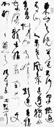 林散之有當(dāng)代草圣之稱(chēng),60歲前游騁于法度之中,學(xué)書(shū),寫(xiě)碑,錘煉書(shū)法線條的力度、澀度、厚度與拙樸趣味;60歲后稍稍有數(shù),就不拘于法,以草書(shū)為專(zhuān)攻。他謀求諸家草法的融合,尤其是將懷素與王鐸兩家草法加以變通,以深厚的漢隸功力來(lái)改造前輩草法,返熟為生,以拙破巧,造就了林散之草體。1972年底,《人民中國(guó)》雜志選拔現(xiàn)代中國(guó)書(shū)法精品向日本介紹,林散之的草書(shū)作品《東方欲曉》得到郭沫若、趙樸初、啟功諸位權(quán)威人物的高度贊譽(yù),名列榜首。