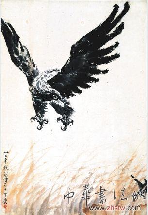 本場拍賣會中,徐悲鴻的《蒼鷹圖》無疑是全場的亮點。此畫幅作于1943年秋,圖上半部僅繪一振翅而起的蒼鷹,怒目圓睜,警覺機敏,利爪粗長,如同刀刃,盡顯兇猛之態(tài)。全畫施墨酣暢淋漓,將墨之濃淡干濕發(fā)揮到了極致,表現出了鷹擊長空的激昂氣勢和強大的力量。