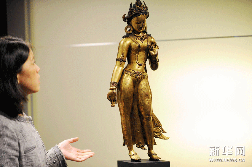 (4)9月7日,工作人員在傳媒預(yù)展上介紹十三世紀(jì)的尼泊爾鎏金銅嵌寶石度母立像,估價(jià)超過7000萬港元。
