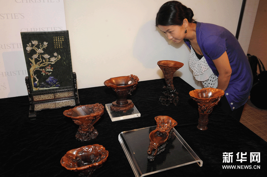 (1)11月16日,佳士得拍賣行工作人員在觀看犀牛角雕刻工藝品。