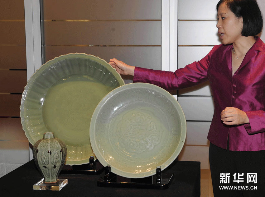 (3)11月16日,專家在展示明朝龍泉青釉盤。