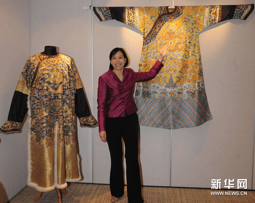 (4)11月16日,專家在介紹清朝明黃緞十二章九龍吉服袍(右),估價(jià)100萬至150萬港元。
