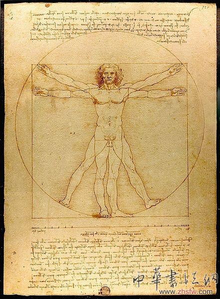 達(dá)·芬奇關(guān)于人體比例的作品──《維特魯威人》。達(dá)·芬奇依照維特魯威的描述畫了《建筑人體比例圖》,在代表宇宙秩序的方和圓中,放入了一個(gè)人體。