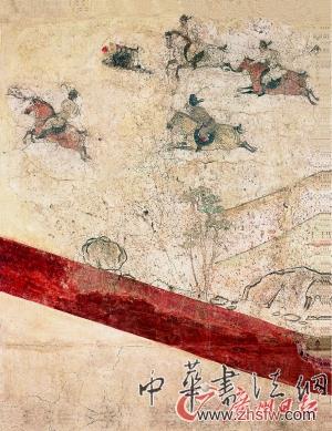 不得不提的還有《馬球圖》的藝術(shù)造詣:整個(gè)畫面采用了鳥瞰式的散點(diǎn)透視法,通過(guò)一種大視角、全景式的描繪,突出表現(xiàn)了五位擊球手驅(qū)馬奔突、爭(zhēng)相擊球的緊張場(chǎng)面,同時(shí)陪襯著一旁立馬觀戰(zhàn)及遠(yuǎn)處山巒間策馬馳騁的數(shù)騎人馬,以及靜靜矗立的五棵參天大樹和嶙峋巨石,形成了動(dòng)與靜、近與遠(yuǎn)、大與小等對(duì)比鮮明的畫面。整幅壁畫氣勢(shì)逼人,造型生動(dòng),無(wú)論是畫人或是畫馬,都逼真、傳神,人、馬、樹、石的布局恰到好處,具有極高的藝術(shù)表現(xiàn)力。