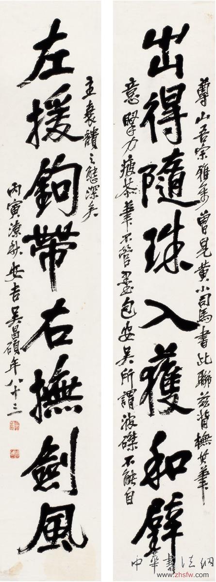 “書到畫時(shí)書亦畫、畫到書時(shí)畫亦書”說的正是西泠印社首任社長吳昌碩先生,與缶翁相關(guān)的作品,無疑是歷屆西泠拍賣熱門藏品的重要構(gòu)成部分,也唯有亮相西泠拍場才獨(dú)顯親切。此次特別推出“吳昌碩親友藏中國書畫作品專場”,是西泠拍賣為紀(jì)念其擔(dān)任西泠印社社長110周年的系列活動(dòng)之一,得益于其家族與西泠印社的淵源,吳昌碩先生的家屬及親友送拍作品超過百余幅,其中包括昌碩先生的繪畫、書法、信札、印章等,并涵蓋了昌碩先生的友人、學(xué)生、后輩及收藏之作品。其中,吳昌碩先生于1926年創(chuàng)作的行書紙本八言聯(lián)很是搶眼,此作品完成后一年吳昌碩先生就駕鶴西去,因此也毫無爭議的可稱為其晚年最具代表性的書法力作,也成為后學(xué)對(duì)這位海派領(lǐng)袖的一筆懷念。