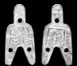戰(zhàn)國時期“下邲陽”背“十七·兩”三孔布正面(左)與背面