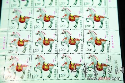 昨日,中國(guó)郵政發(fā)行第三輪生肖馬年《甲午年》特種郵票,單張郵票面值1.20元。同期發(fā)行的還有大版整張20枚、四方聯(lián)PZ折、含10枚特種郵票的小本票、首日封等藏品。