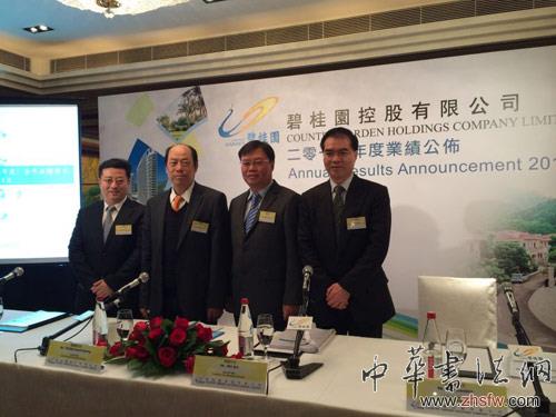 碧桂園集團(tuán)高層出席發(fā)布會(huì)現(xiàn)場(chǎng),從左到右分別是:聯(lián)席總裁朱榮斌、董事局主席楊國(guó)強(qiáng)、總裁莫斌、首席財(cái)務(wù)官吳建斌