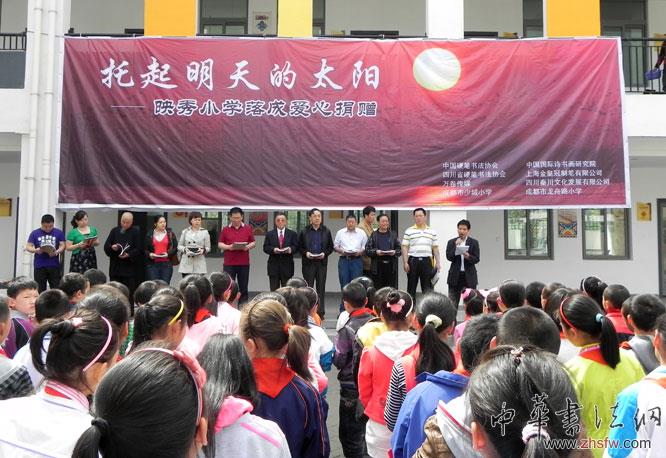 5月4日,以“托起明天的太陽(yáng)”為主題的,由中國(guó)硬筆書(shū)法協(xié)會(huì),四川省硬筆書(shū)法協(xié)會(huì),萬(wàn)卷傳媒,成都市少城小學(xué),中國(guó)國(guó)際詩(shī)書(shū)畫(huà)研究院,上海金皇冠制筆有限公司,四川秦川文化發(fā)展有限公司,成都市龍舟路小學(xué)聯(lián)合舉行的送文化活動(dòng)到汶川特大地震中心的映秀小學(xué)校,捐贈(zèng)書(shū)法字帖和演出活動(dòng)上次十時(shí)在映秀小學(xué)校如期開(kāi)展,全校師生近200人參加了捐贈(zèng)書(shū)法字帖和演出活動(dòng)。