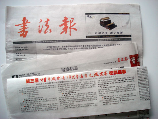 ▲圖為刊登在2010年9月15日第36期(總1333期)《書法報》第四版的征稿啟事像片