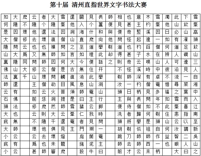 《佛祖直指心體要節(jié)》一書(shū)是現(xiàn)存世界最古老的金屬活字印刷書(shū)籍(簡(jiǎn)稱直指),已被聯(lián)合國(guó)教科文組織收錄為世界文化遺產(chǎn)。為繼承和發(fā)揚(yáng)優(yōu)秀的民族創(chuàng)作藝術(shù)精神,通過(guò)書(shū)法弘揚(yáng)《直指》文化,特在《直指》的故鄉(xiāng) — 韓國(guó)清州市舉辦“韓國(guó)第十屆清州直指國(guó)際書(shū)法大賽”。