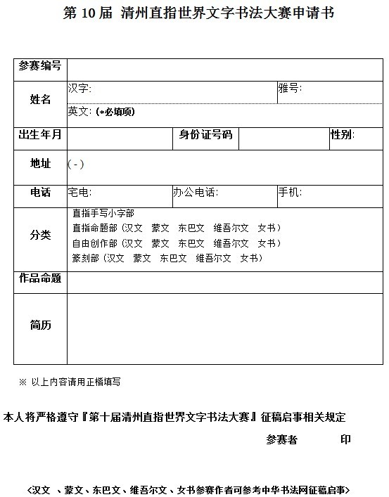 - 參賽者必須詳細(xì)填寫(xiě)參賽申請(qǐng)書(shū),登陸中華書(shū)法網(wǎng)(http://www.shxw.com/)下載即可.