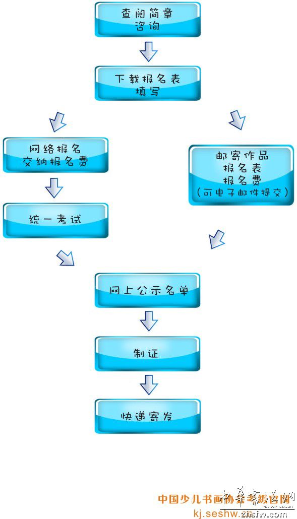考生將《少兒書畫藝術(shù)等級(jí)評(píng)定報(bào)名登記表》、1寸照片3張,及考級(jí)費(fèi)用交至評(píng)級(jí)辦公室,考生按準(zhǔn)考證所示時(shí)間、地點(diǎn)參加考試。