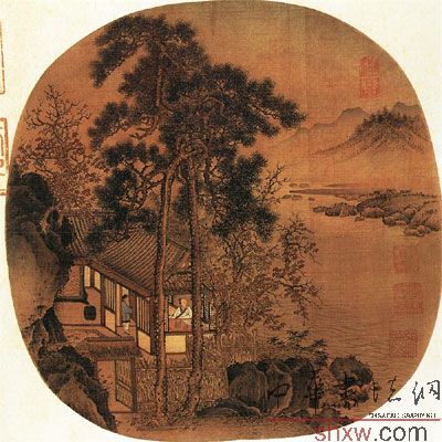 圖中兩株松樹高聳挺拔, 四周枝葉繁茂,遠(yuǎn)山如帶,林中房舍隱現(xiàn), 山石用斧劈皴和淡水墨渲染相結(jié)合,畫面貌較之李唐山水為秀潤。