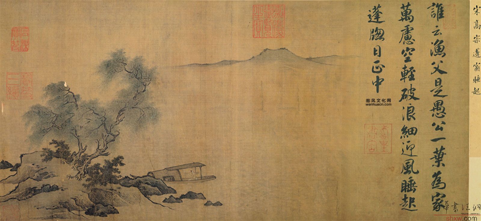 這幅“蓬窗睡起”畫幅右側(cè),尚有南宋孝宗書寫由高宗(1107-1187)所作的漁夫詞。這不僅提示了畫中詩意的來源,也顯示了宋代對漁隱生活的向往之情,就連皇帝也難以抗拒。無論如何,此畫筆墨清潤,邊角的構(gòu)圖里,展現(xiàn)了清曠的水天與幽渺的遠(yuǎn)山,雖然未必為高宗所親作,但也確是一幅南宋院畫佳構(gòu)。
