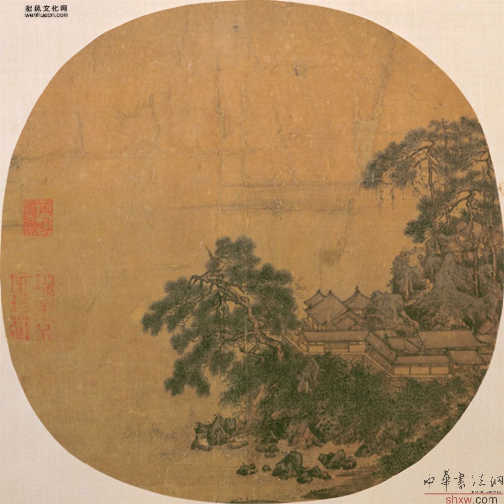 在這幅“秋溪待渡”圖中,人物、屋宇均描繪得細(xì)膩精微,含蓄、蘊(yùn)藉的筆墨設(shè)色,與許多北宋與南、北宋之交的山水畫(huà)大師,如關(guān)仝、郭熙、李唐等近似,因此,推測(cè)這幅山水小品佳作應(yīng)是一件北宋末的畫(huà)跡。