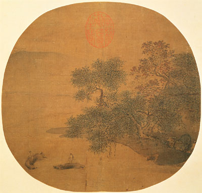 宋朝偏安江南,江南水鄉(xiāng)的杏花春雨,便逐漸取代華北的千巖萬(wàn)壑,成為畫(huà)家描繪的主要對(duì)象。反映在作品里,除了云煙彌漫外,最大的特色,便是“水”的增加。在這幅“遠(yuǎn)水揚(yáng)帆”里,我們可以看出吸引隱士策杖前來(lái)的,除了遠(yuǎn)山帆影外,也正是這一片映照山、天之影的江水。