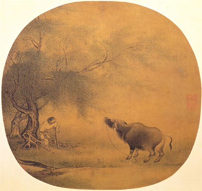 宋代偏安江南后,出現(xiàn)了許多像這樣以江南為背景的牧牛圖,也有不少兼善畫(huà)此一題材的名家,例如:李唐、李迪、閻次平等。畫(huà)牛在中國(guó)由來(lái)已久,但是唯有南宋畫(huà)家最能兼融情景,寫(xiě)盡人、牛的情態(tài)。這幅“柳塘呼犢”圖,畫(huà)家以極細(xì)膩而又充滿變化的筆觸,寫(xiě)出這幕風(fēng)與柳樹(shù)、老牧人與牛之間的對(duì)話,是南宋牧牛圖中絕妙的佳作。這幅“柳塘呼犢”圖,畫(huà)家以極細(xì)膩而又充滿變化的筆觸,寫(xiě)出這幕風(fēng)與柳樹(shù)、老牧人與牛之間的對(duì)話,是南宋牧牛圖中絕妙的佳作。