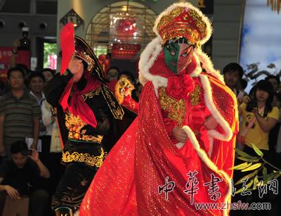 四川參展團(tuán)的演員在深圳文博會(huì)上表演川劇「雙人變臉」