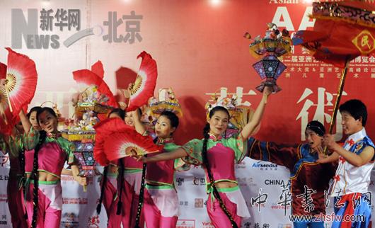 1月29日,來自國家非物質(zhì)文化保護故里——江西省石城縣民間藝術(shù)工作者在第二屆亞洲藝術(shù)博覽會開幕式上表演彩燈舞。當晚,第二屆亞洲藝術(shù)博覽會在北京中國國際貿(mào)易中心舉行開幕式。此屆亞洲藝術(shù)博覽會除了展示繪畫、雕塑、影像等藝術(shù)品外,又增加了非物質(zhì)文化遺產(chǎn)展覽、表演專館,同時開設(shè)亞洲藝術(shù)高峰論壇。