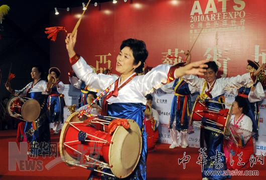 來自韓國的藝術(shù)工作者在第二屆亞洲藝術(shù)博覽會開幕式上表演長鼓舞。