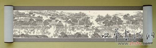 由江蘇省花鳥畫研究會(huì)副會(huì)長(zhǎng)、 著名畫家孫元亮歷時(shí)25載創(chuàng)作的國(guó)畫長(zhǎng)卷《秦淮勝跡圖》,早在3年前就申請(qǐng)世博特許銷售商品,因“代表中華民族傳統(tǒng)文化,長(zhǎng)卷內(nèi)容與上海世博會(huì)主題——“城市,讓生活更美好”相呼應(yīng),展現(xiàn)出極高的原創(chuàng)藝術(shù)水準(zhǔn)和學(xué)術(shù)文獻(xiàn)價(jià)值”而被上海世博會(huì)事務(wù)協(xié)調(diào)局相中授權(quán),在全國(guó)各省選送的數(shù)以千計(jì)的書畫作品中脫穎而出,成為書畫類唯一的特許專賣商品。這幅長(zhǎng)達(dá)12.80米、載有2000余各色人物的全景式長(zhǎng)卷,以白描手法摹寫了厚實(shí)的“古秦淮”城市文化生活,畫面集人物、山水、建筑于一體,精彩地再現(xiàn)出鼎盛時(shí)期的中國(guó)明代古都南京的民俗生活、自然風(fēng)光和歷史勝跡,畫面層次分明,自然流暢,堪稱是現(xiàn)代版又一幅《清明上河圖》。書畫名家趙樸初、陳立夫、啟功、亞明生前為畫卷題跋?!肚鼗磩氽E圖》長(zhǎng)卷由北京印鈔廠印刷,全球限量發(fā)行6000卷,為首次面向海內(nèi)外隆重推出,值得珍藏。(朱同)