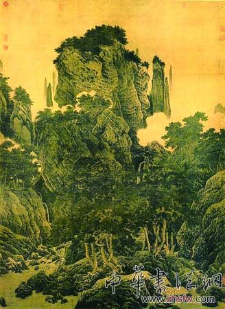 李唐的這幅畫,給人的第一印象就是奇峰聳峙,險峻巍峨。高大的主峰傲然屹立,似乎要頂破蒼穹。周圍,有數(shù)座刀劈斧削的險峰環(huán)抱,更加襯托出主峰的博大雄強。山頂上林木蔚然,險峻中不乏神秀華潤。視線到了山半腰,只見白云繚繞間,有一大片古松,茂密蒼翠,白云浮游飄渺,幻化出一個蜃蜃渺渺的境界。遠處,山麓以至山頂,也是一片片蒼郁的松林。而山下近處的松林,就如同秀挺在眼前一般,在統(tǒng)一和諧中顯現(xiàn)出一種五彩斑斕的韻味。松樹干用中鋒勾出,背部的松鱗刻畫得細膩傳神。松針用細筆快寫,筆筆挺拔利落。樹葉用大面積的濃墨渲染,又破以淡墨,使人感覺滿目蒼綠,郁郁蔥蔥。又有各種姿態(tài)的小枝穿插其間,整個松林平添了一種有風吹過的動感。