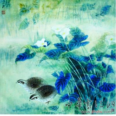 謝小莉的工筆花鳥在三個方面達到了一定的高度:一是造型結構不依賴于古代典籍,“師古而不泥于古”,秉承“外師造化,中得心源”的古訓,認真觀察自然的花鳥情態(tài),在與萬物的悄然相視中獲得形象的本體屬性,在細節(jié)和整體上都傳達出自然生命的真實表情;二是構圖造境溫婉恬靜,畫面上的鳥兒、南瓜、植物布局疏密有致,營造出清新浪漫的韻律格局;三是在精致的描摹中展現(xiàn)其扎實的繪畫功力,她將渲染、勾勒、線條、敷彩這些技術語言運用得非常熟練,作品經(jīng)得起細細品味。(子牧)