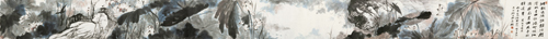 張大千1934年在北京頤和園聽(tīng)鸝館中所作《荷塘月色》卷領(lǐng)銜中國(guó)近現(xiàn)代書(shū)畫(huà)部分。《荷塘月色》卷為張大千寫(xiě)贈(zèng)當(dāng)時(shí)著名的春華樓白永吉大廚所作,系其壯年時(shí)極痛快淋漓的荷花作品,其尺幅也極為巨大,由丈二匹紙四開(kāi)后兩張對(duì)接(46×622cm)而成,堪稱(chēng)當(dāng)時(shí)無(wú)雙之制。