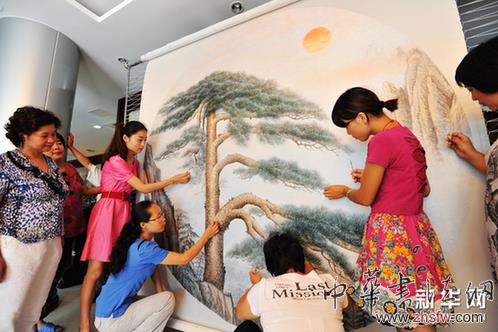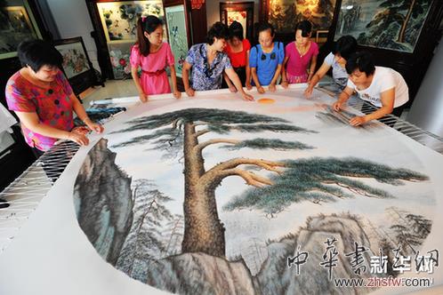 8月27日,在江蘇蘇州鎮(zhèn)湖盧福英蘇繡制作中心,創(chuàng)作大型刺繡作品《黃山迎客松》的繡娘們?cè)趯?duì)作品進(jìn)行最后檢查。新華網(wǎng)圖片 徐志強(qiáng) 攝