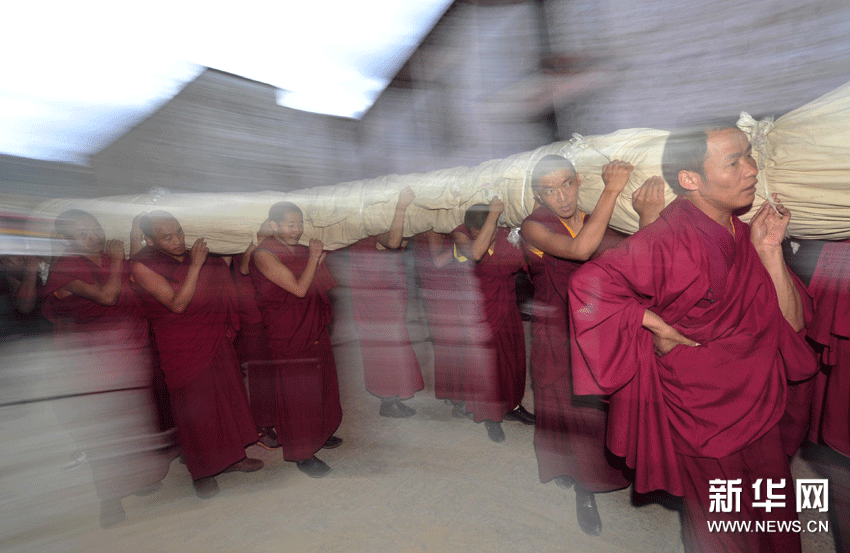 (3)8月29日,拉薩哲蚌寺僧人將卷起的巨幅釋迦牟尼佛像唐卡抬向展佛臺。