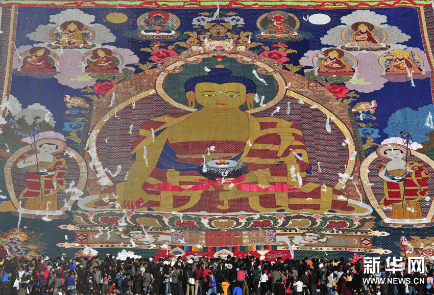 (10)8月29日,拉薩哲蚌寺,信眾將哈達投向巨幅釋迦牟尼佛像唐卡。