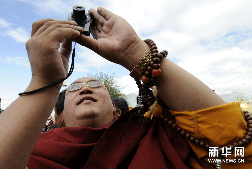 (6)8月29日,一名僧人在色拉寺拍攝佛像。