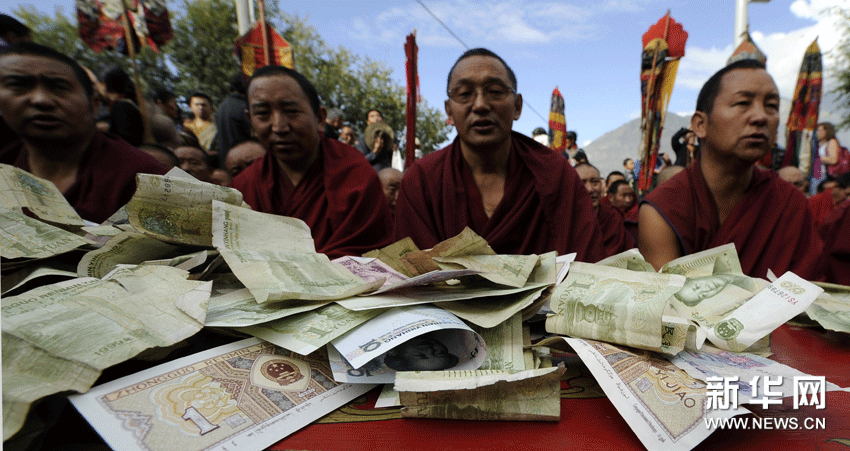 (11)色拉寺展佛場所,信徒發(fā)放的布施(8月29日攝)。