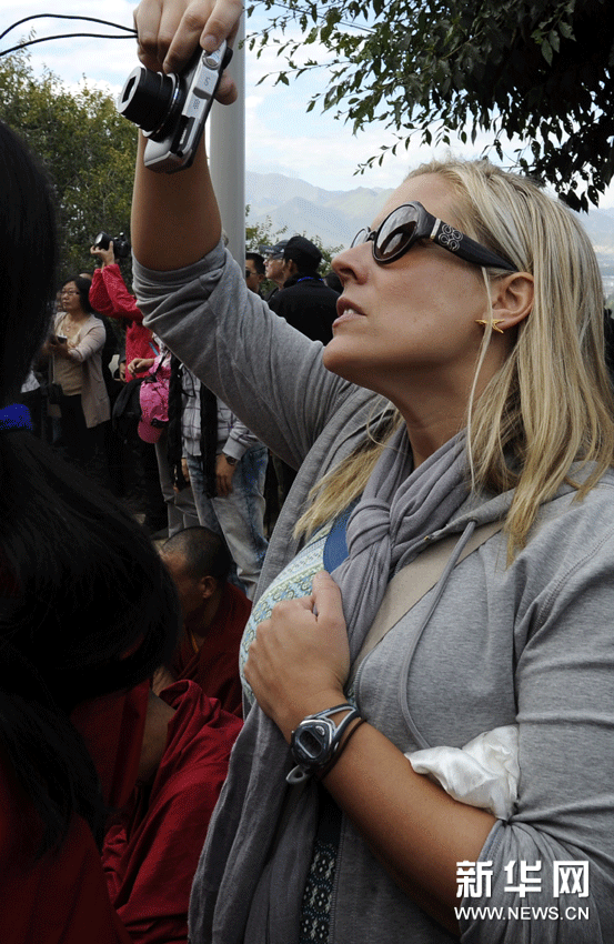 (8)8月29日,一名外國游客在色拉寺展佛現場。