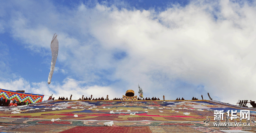 (1)8月29日,拉薩哲蚌寺僧人慢慢將卷起的巨幅釋迦牟尼佛像唐卡在展佛臺上展開。