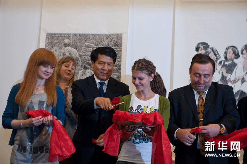 (1)9月13日,在俄羅斯首都莫斯科,中國駐俄羅斯大使李輝(前左二)等嘉賓為“陜西國畫名家作品展”開幕剪彩。