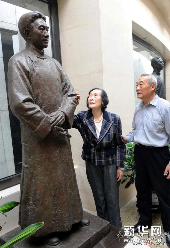 10月12日,88歲高齡的徐悲鴻紀(jì)念館館長(zhǎng)、徐悲鴻先生的夫人廖靜文(左)在兒子徐慶平的陪同下,在北京中華世紀(jì)壇中華文化名人雕塑館參觀徐悲鴻雕像。中華文化名人雕塑館是在今年4月揭幕的,共豎立了由國(guó)內(nèi)藝術(shù)家雕刻的40位中華文化名人的青銅像。 新華社記者李曉果攝