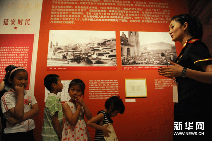 (3)5月27日,來自延安革命紀(jì)念館的講解員在為孩子們介紹展出作品。